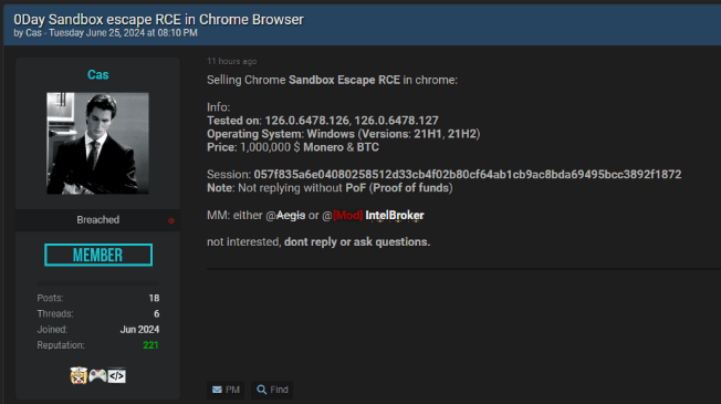 Por ejemplo, durante la monitorización de fuentes abiertas, el analista de inteligencia detectó la venta de un exploit para Chrome anunciado como “0-Day Sandbox Escape RCE in Chrome Browser”. El anuncio incluía el precio, los sistemas operativos afectados y las versiones de la aplicación en las que se había probado el exploit. Con la información recabada, el CERT analizó las posibles afectaciones y emitió un aviso restringido a sus miembros para que reforzaran las reglas de detección y aumentaran las actividades de threat hunting en los registros asociados al proceso de Chrome.
